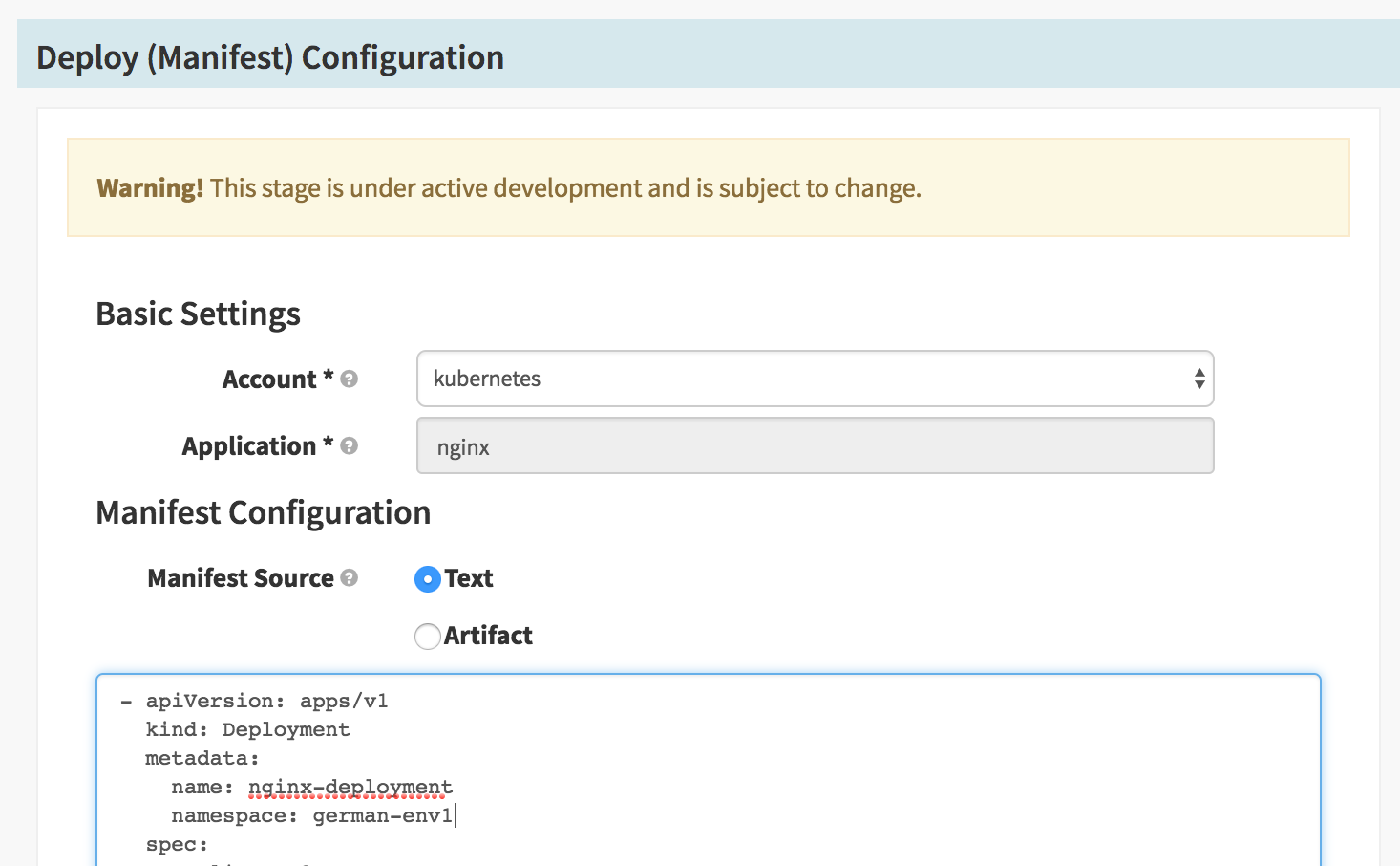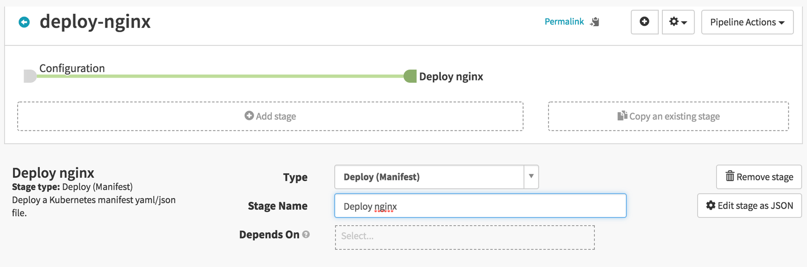 We’ll be supplying the manifest directly in the Deploy (Manifest) stage as text for simplicity, but it can also be taken from a version control system like Github: