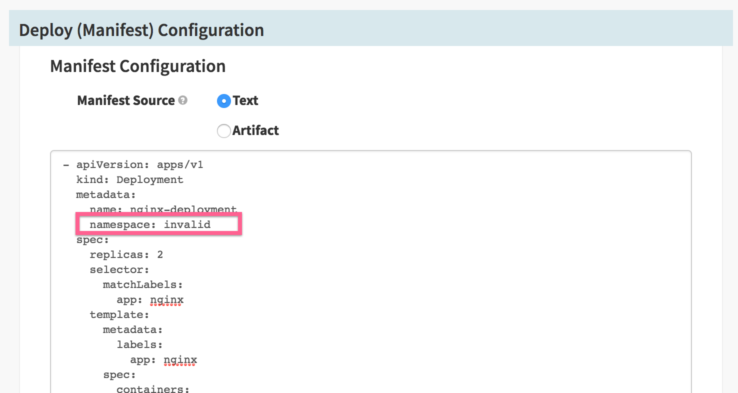 Now we’ll do a rollback test by changing the manifest, providing an invalid value for the namespace to force a failure. In deploy-nginx we’ll change the namespace to an invalid value: