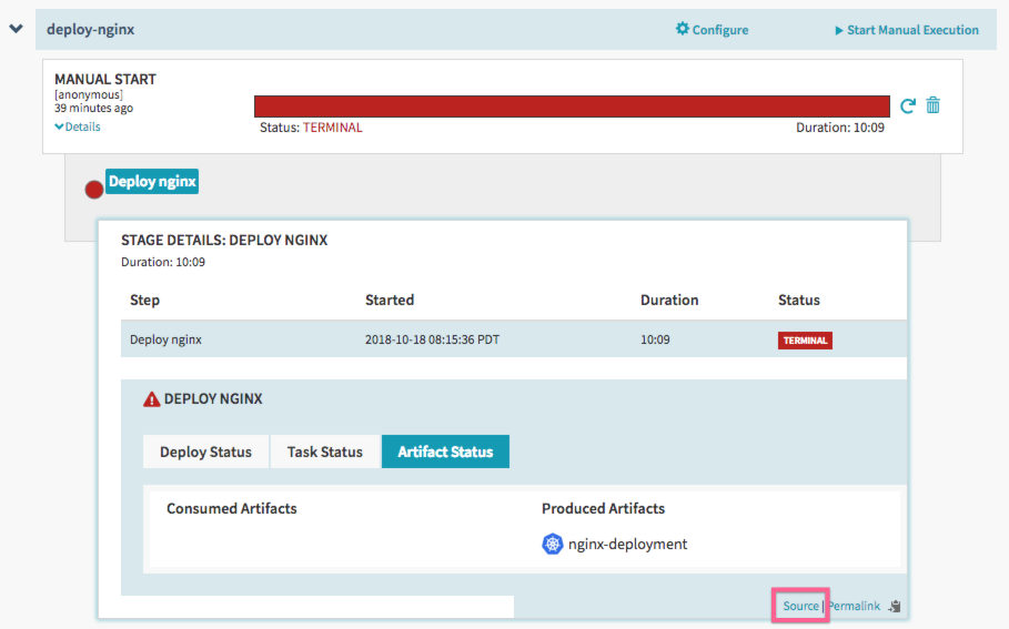 • A stage of type deployManifest in the trigger pipeline execution that failed.