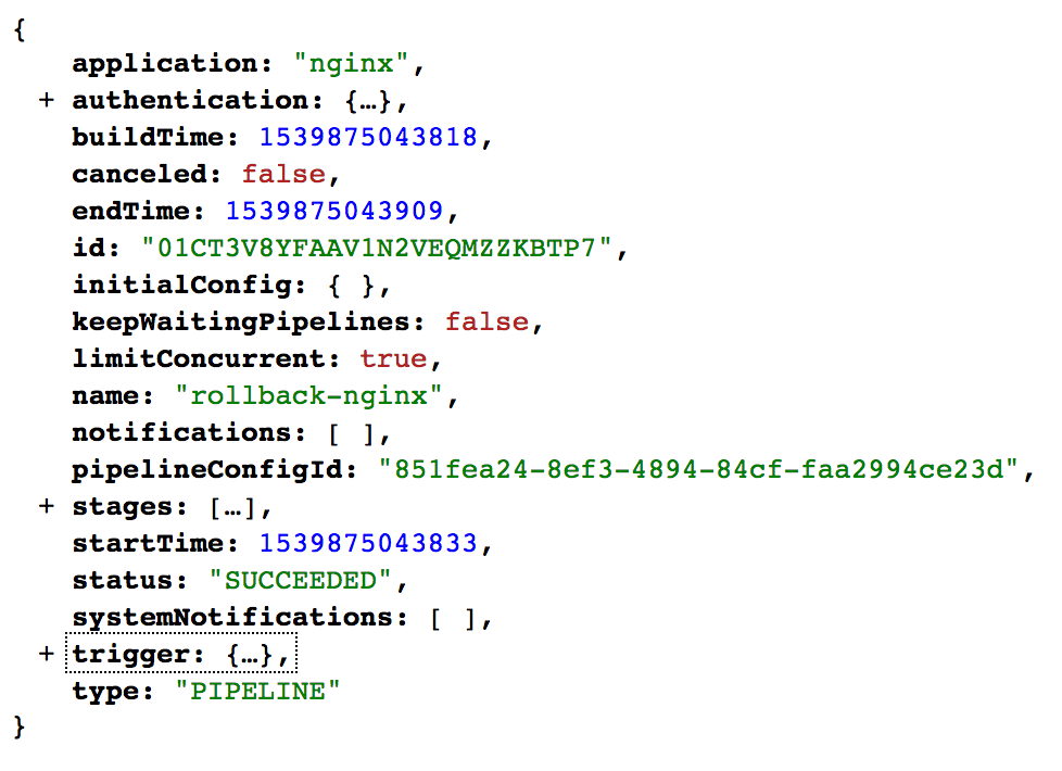 This allow us to write expressions that continue the pipeline only if a broken deployment occurred. Every pipeline execution has a “context” object holding information about all aspects of execution. We can see this information clicking the “Source” link inside the details of a previous execution:
