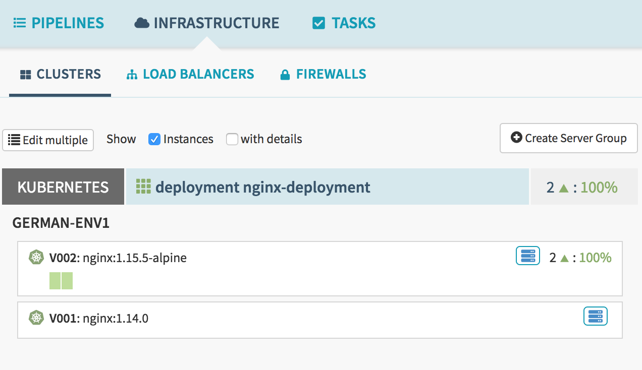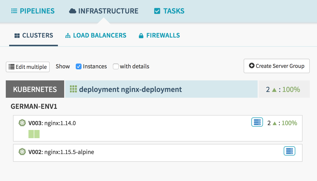 We’ll test rollbacks by making a change to the deployment manifest and running the pipeline again, so that we’ll end up with two historic versions of the deployment. First we’ll edit the manifest to change nginx image version from nginx:1.14.0 to nginx:1.15.05-alpine and then run the pipeline. Now under infrastructure view we’ll see that we have two historic versions of the deployment: