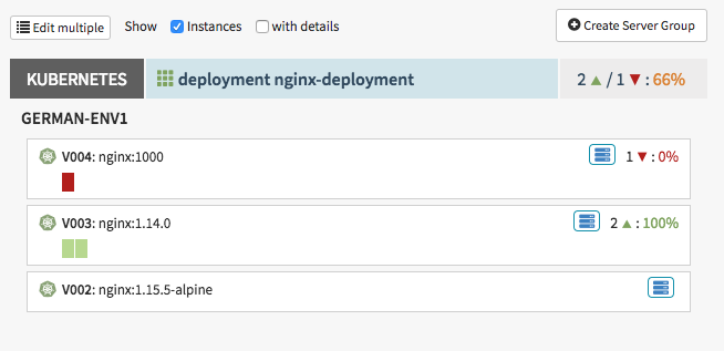 This is clearly not what we want, although the previous version (V003 - nginx:1.14.0) is still active and running, we have a failed server group (replica set) that cannot be started, so the rollback pipeline is still necessary to clean this up. In the next section we’ll look at a more advanced way for detecting when to apply a rollback.