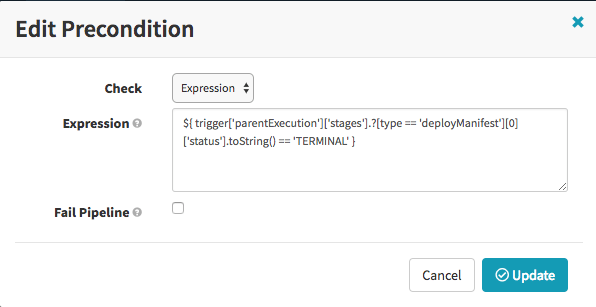 ${ trigger['parentExecution']['stages'].?[type == 'deployManifest'][0]['status'].toString() == 'TERMINAL' }