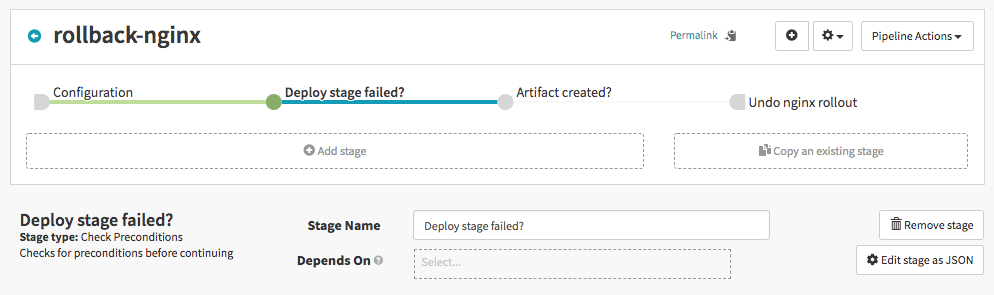A deployment pipeline can fail because of many different reasons, but a rollback needs to be executed only in case something broken was deployed. One way to detect this is by using conditional checks with Spring Expressions to detect the case where something broken was deployed. In the rollback pipeline we’ll add two more stages of type “Check Preconditions” before the Undo Rollout stage:
