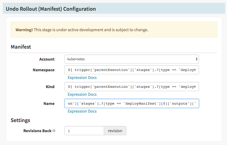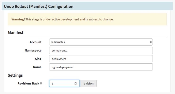 This pipeline just contains a single stage of type Undo Rollout (Manifest) with the following configuration: