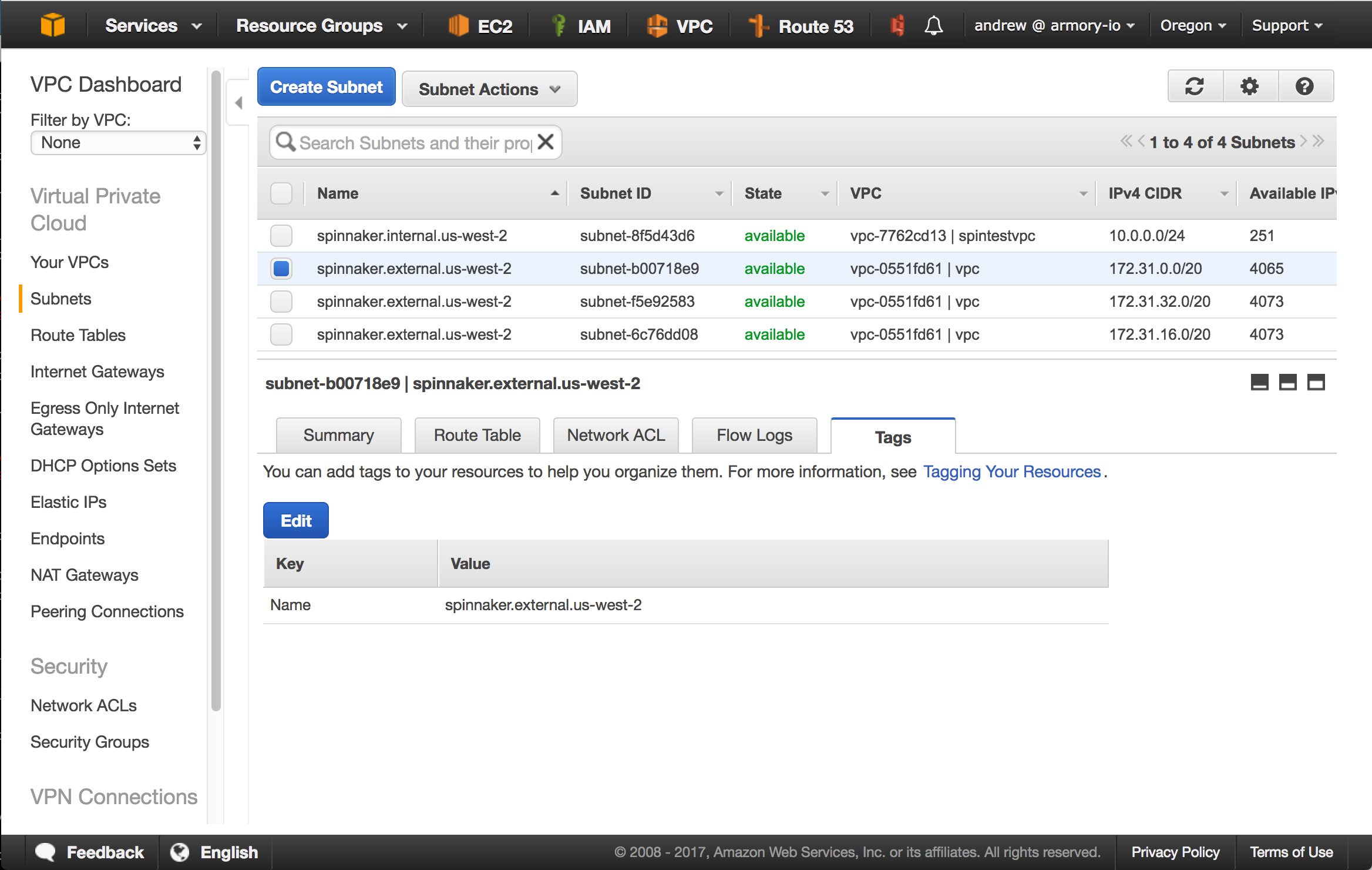 There are two ways you can tag them. One option is to use the convention spinnaker.<internal|external>.<region> for the subnet’s name. In the screenshot below, you can see that is what I have done on my subnets.
