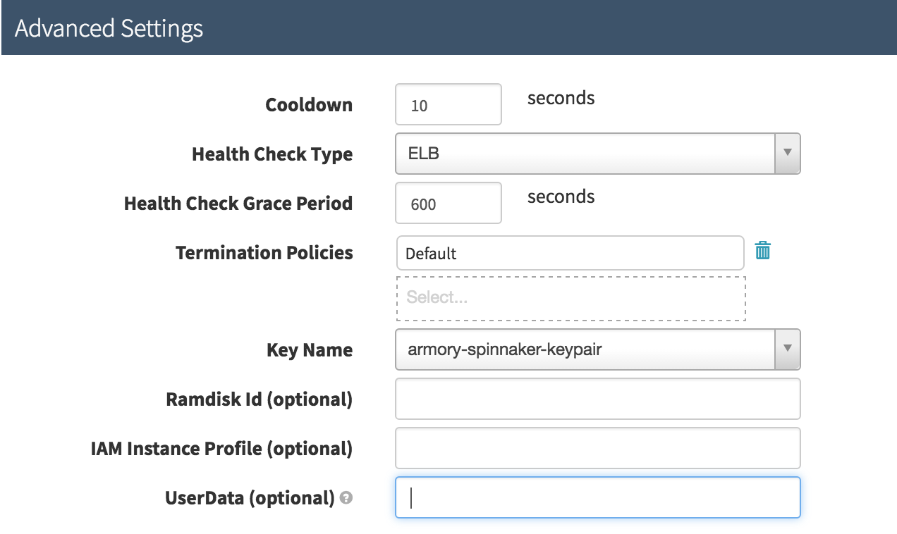 Adjust the UserData template using information from Clouddriver’s AWS UserData README. When we use that option we normally point udfRoot at something like /opt/spinnaker/config/custom-udf, and then add the custom-udf directory to the config package we release Spinnaker from. If you want to turn it off completely that means just adding the udfRoot option to clouddriver-local.yml, and putting a blank file at /opt/spinnaker/config/custom-udf/udf0 .