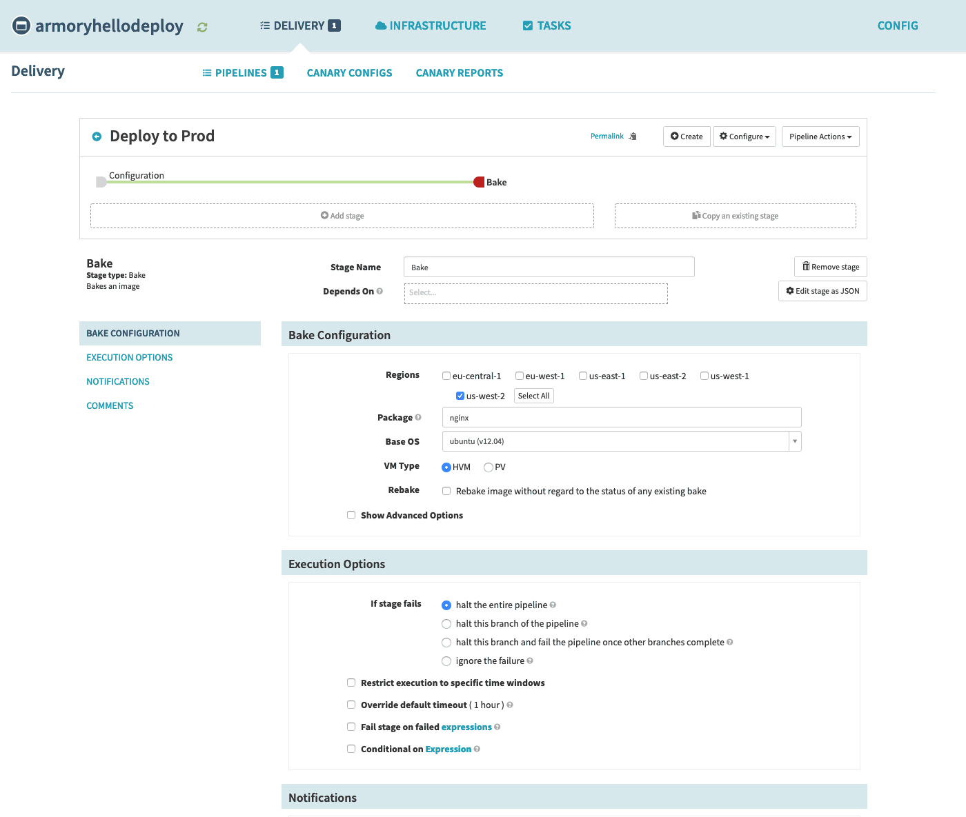 Navigate to the configuration screen of the previously created pipeline from the Bake Amazon Machine Images in a Spinnaker Pipeline guide.