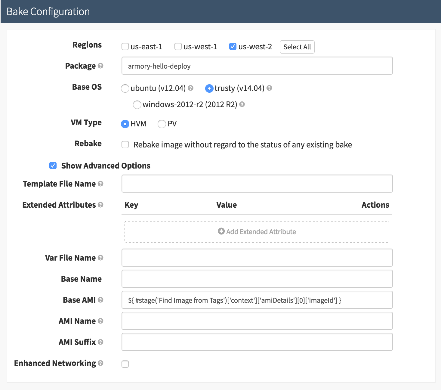 Next I want to add my own package to this AMI. First, I add a bake stage. Since my Jenkins’ job created an artifact named ‘armory-hello-deploy’, I input that into the ‘Package’ field. The next part is a little tricky. I need to specify the correct base AMI by checking the ‘Show Advanced Options’ and using the expression language in the ‘Base AMI’ field.