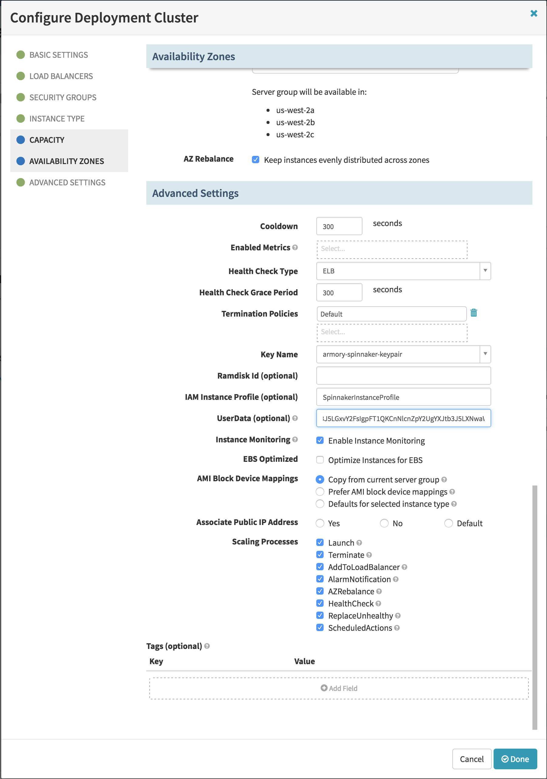 If you are creating a deployment configuration for AWS, Spinnaker gives you the option to provide user-data. As you can see here: