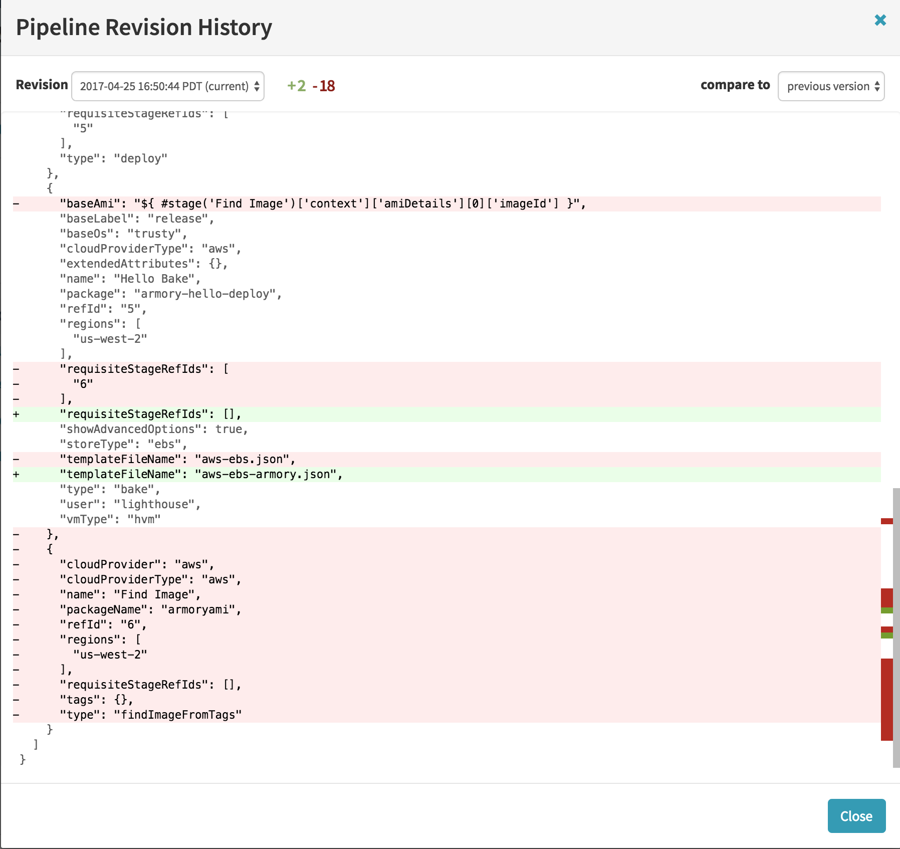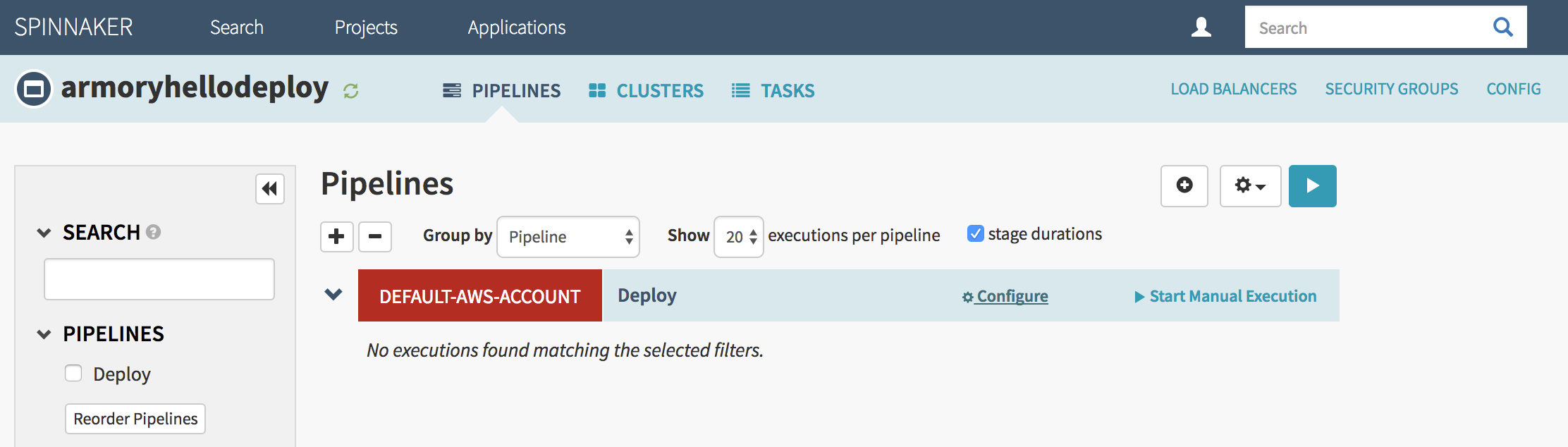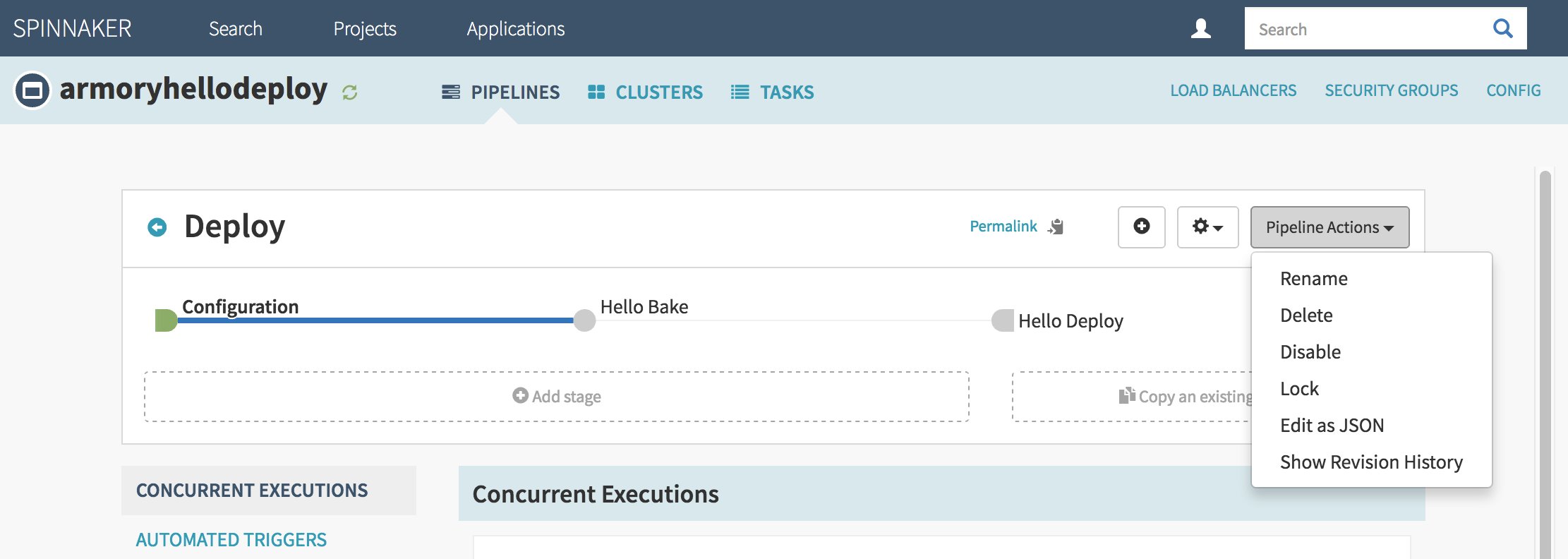 Pipelines are a combination of stages that enable very sophisticated coordination and branching. They are the key to orchestrating deploys in Spinnaker and each one is specific to an application. To see an application’s pipelines, select ‘Applications’ from Spinnaker’s top navigation bar, click on an application’s name, and then press the ‘Pipelines’ tab. The result from a pipeline running is called an execution.