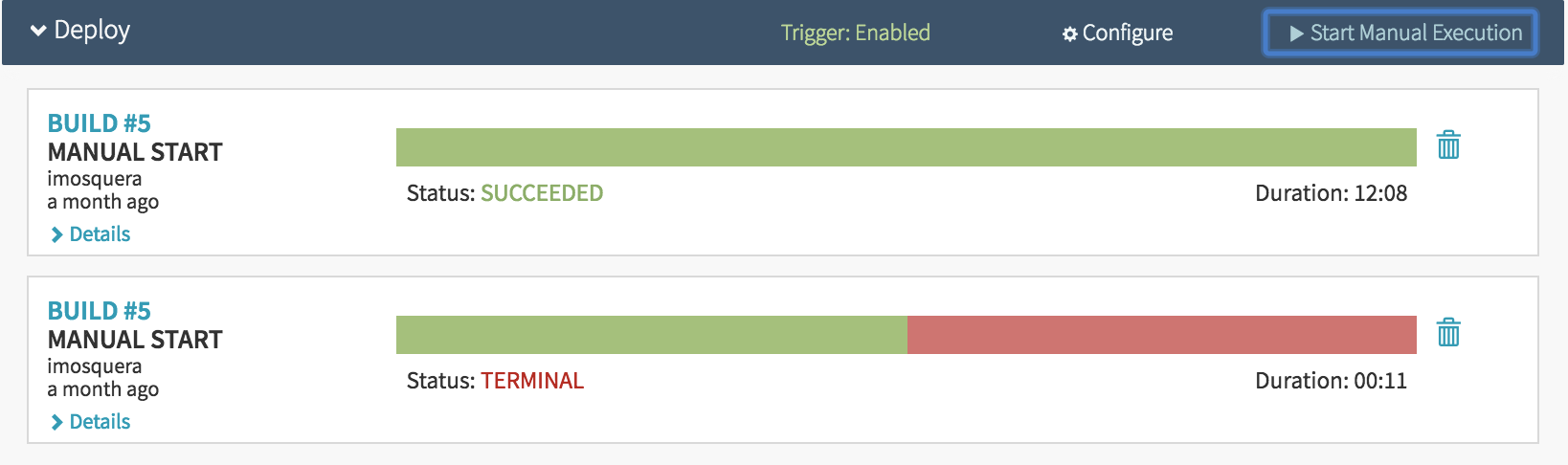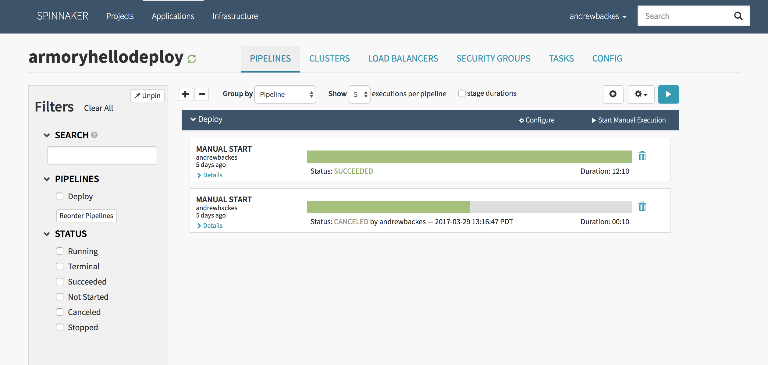 There is a pipeline called ‘Deploy’ with two executions, both labeled ‘Manual Start’. The top execution is marked as ‘Succeeded’ while the bottom is marked as ‘Cancelled’.